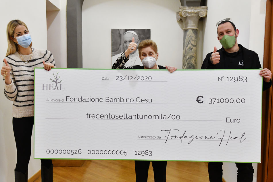 L'assegno è stato consegnato alla Presidente della Fondazione e dell'Ospedale Bambino Gesù Mariella Enoc, da Elena Santarelli Madrina e da Simone De Biase, Fondatore e Segretario della Fondazione Heal.