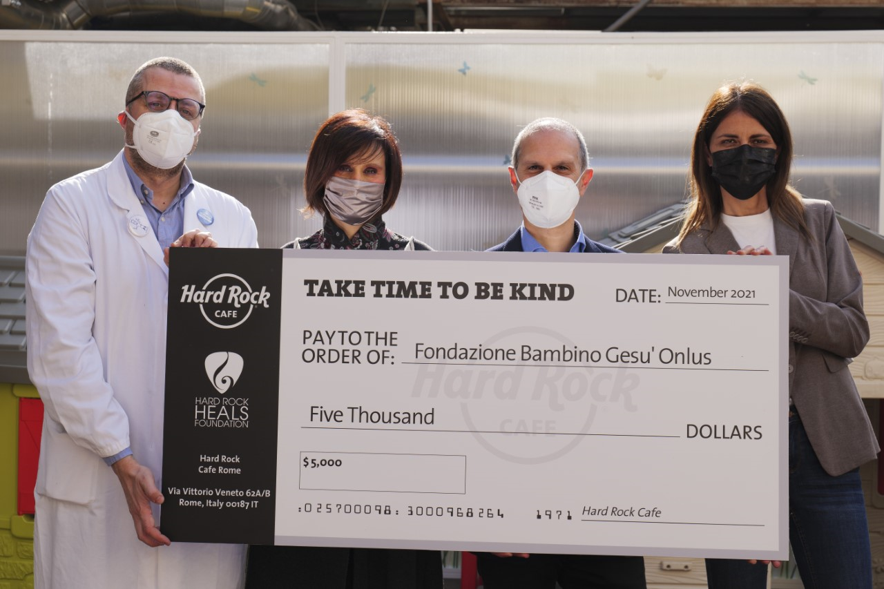 Presenti alla simbolica consegna dell’assegno Alessandro Crocoli Responsabile dell'Unità Operativa Semplice di Chirurgia Oncologica dell’Ospedale Pediatrico Bambino Gesù e Alessio Bisogni General Manager dell'Hard Rock Cafe di Roma.