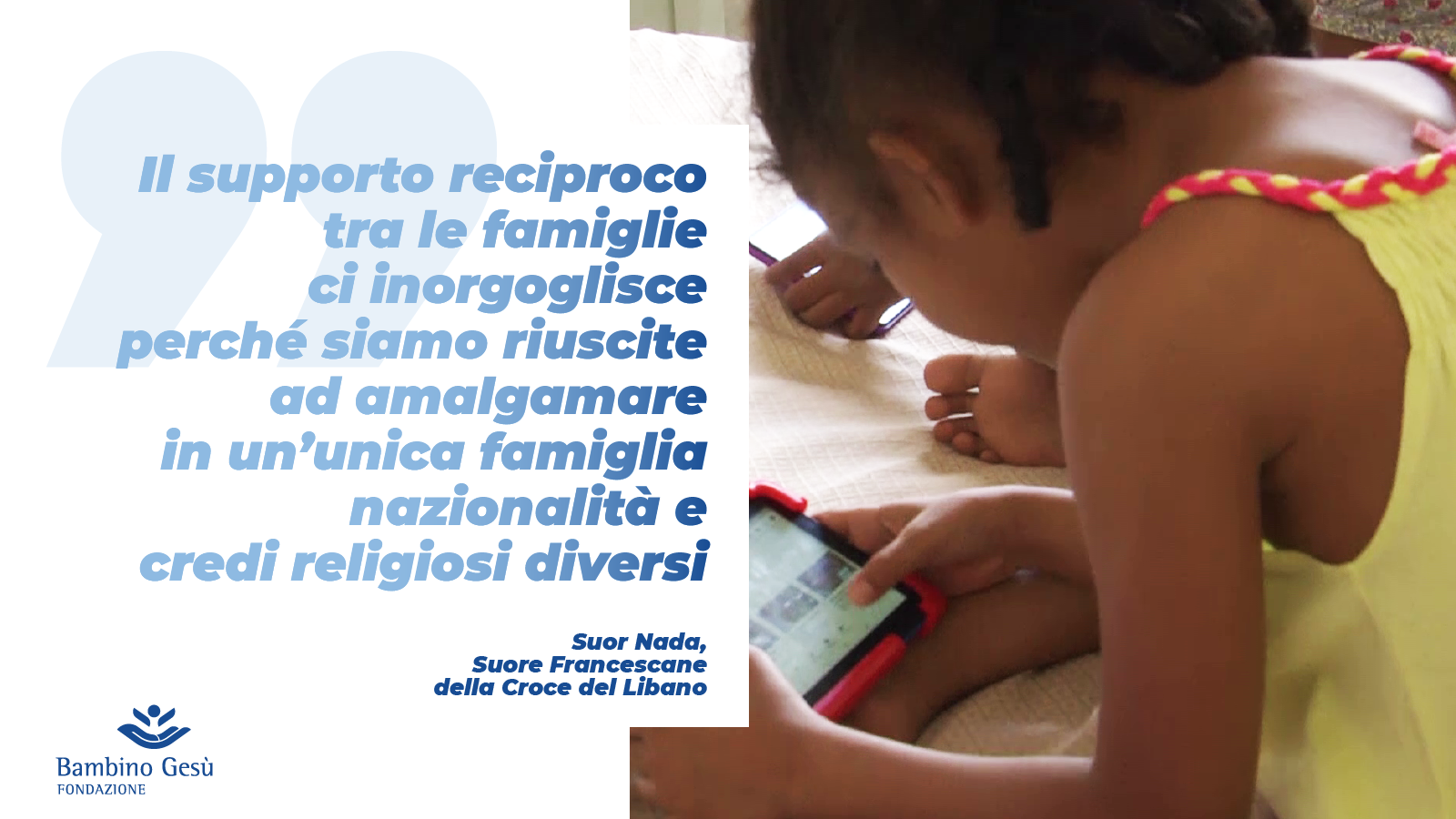 La Fondazione Bambino Gesù porta avanti diversi progetti dedicati all’accoglienza delle famiglie che devono affrontare un periodo di cura. Tra le strutture che collaborano con la Fondazione, mettendo a disposizione vitto e alloggio per le famiglie spesso provenienti da Paesi lontani, c’è la “Casa per ferie” delle Suore Francescane della Croce del Libano.