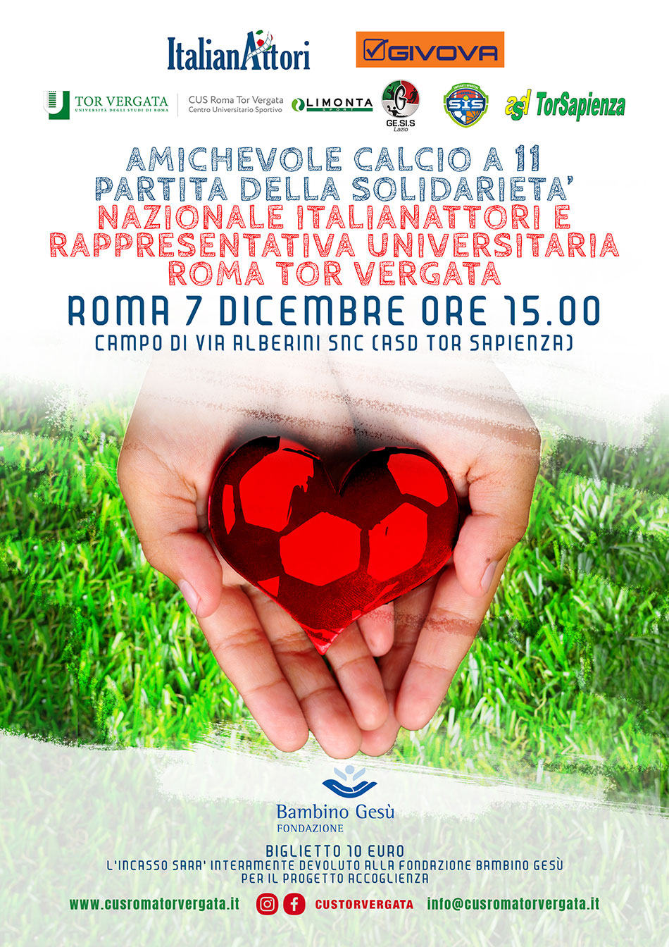Il 7 dicembre alle ore 15:00 presso il campo di via Albertini scn (ASD Tor Sapienza) si terrà l'amichevole di calcio a 11 tra la Nazionale Italianattori e la Rappresentativa Universitari di Roma Tor Vergata.