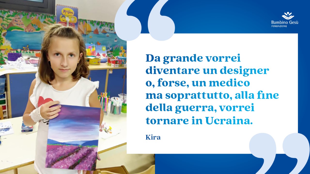 Quando l’occupazione Russa è arrivata a Konotop (350 km da Kiev), attraverso corridoi umanitari, la famiglia ha potuto raggiungere la Polonia e da lì la Turchia, dove la mamma aveva dei conoscenti che avrebbero voluto aiutarli. Il viaggio ha debilitato Kira e all’arrivo in Turchia la sua situazione richiedeva cure immediate, ma la mancanza di assicurazione medica ha impedito anche l’esecuzione di semplici prelievi. La mamma ha quindi iniziato la ricerca su Internet, dove ha reperito le notizie sul nostro ospedale e sulle associazioni umanitarie che potevano aiutarla ad arrivare. E così è stato: a maggio, in aereo, sono giunte a Roma e, grazie alla Protezione Civile, hanno raggiunto il Bambino Gesù e trovato accoglienza all’interno delle strutture alloggiative dell’Ospedale.