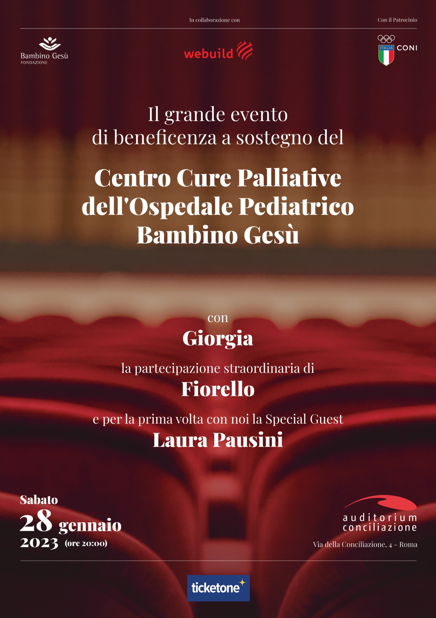 Aperte le prevendite per l'eccezionale concerto solidale del 28 gennaio 2023, all'Auditorium Conciliazione di Roma, con Giorgia, la partecipazione straordinaria di Fiorello e per la prima volta con noi la nostra special guest Laura Pausini. Alla serata saranno presenti anche grandi Olimpionici e campioni Mondiali, i cui nomi verranno presto svelati.