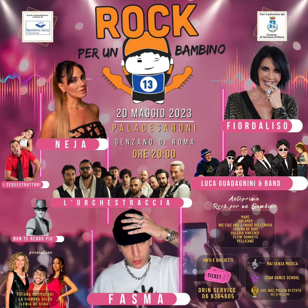 Roma - Sabato 20 maggio 2023 torna l’atteso evento benefico Rock per un Bambino patrocinato dal Comune di Genzano di Roma e dalla Fondazione Bambino Gesù ONLUS nato nel 2009 da un’idea e dalla volontà di Luca e della moglie Genni di trasformare il dolore per la perdita della loro bambina, Aurora, in una “festa” della musica per una raccolta fondi a favore dell’Ospedale Pediatrico Bambino Gesù di Roma.