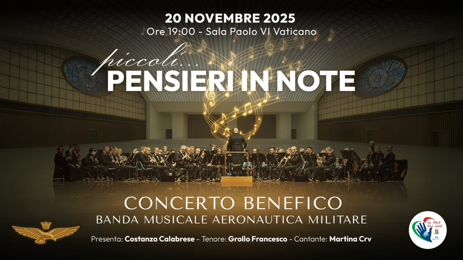 La Banda Musicale dell’Aeronautica Militare sarà protagonista giovedì 20 novembre 2025, alle ore 19:00, nell’Aula Paolo VI in Vaticano, del concerto benefico “Piccoli… Pensieri in Note”, organizzato e promosso in collaborazione con la Fondazione Bambino Gesù.
