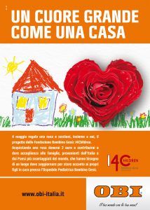 L’iniziativa di raccolta fondi, “Un cuore Grande come una casa”, sarà lanciata da OBI in occasione della festa della mamma e dedicata all’accoglienza delle tante famiglie provenienti dall'Italia e dai Paesi più svantaggiati del mondo, che necessitano di un luogo dove soggiornare per stare accanto ai propri figli in cura presso l'Ospedale Pediatrico Bambino Gesù.